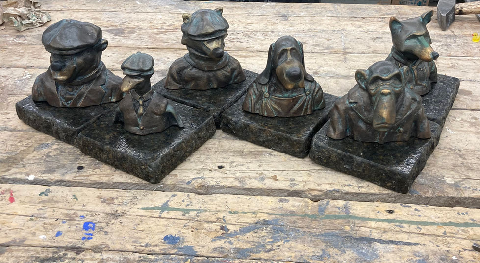 Along with the illustrations I forged a steel gate, built a copper lamp, and casted the characters in bronze for my senior exhibition at Northern Michigan University. "The Flat Caps" project was awarded first prize.